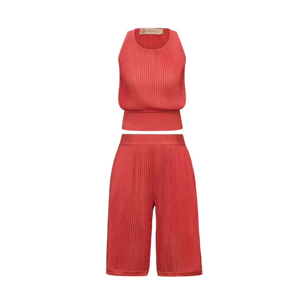 O Conjunto Boldró é a tradução do conforto sofisticado. Feito em tricot texturizado com leve brilho e sutil transparência, envolve o corpo com fluidez e modernidade. A regata de corte reto e decote arredondado é prática e versátil, enquanto a bermuda com bolsos e cós largo garante caimento impecável e liberdade de movimento. Juntos, formam um conjunto contemporâneo que transita facilmente do dia à noite, da praia à cidade.