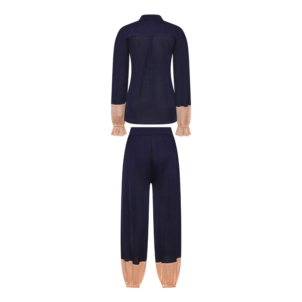 A calça de modelagem ampla, com cós elástico, oferece liberdade e caimento impecável, enquanto a camisa de mangas longas e punhos marcados garante um visual refinado e versátil. Juntos, formam um conjunto harmônico que pode ser usado completo ou combinado separadamente, sempre com presença marcante.